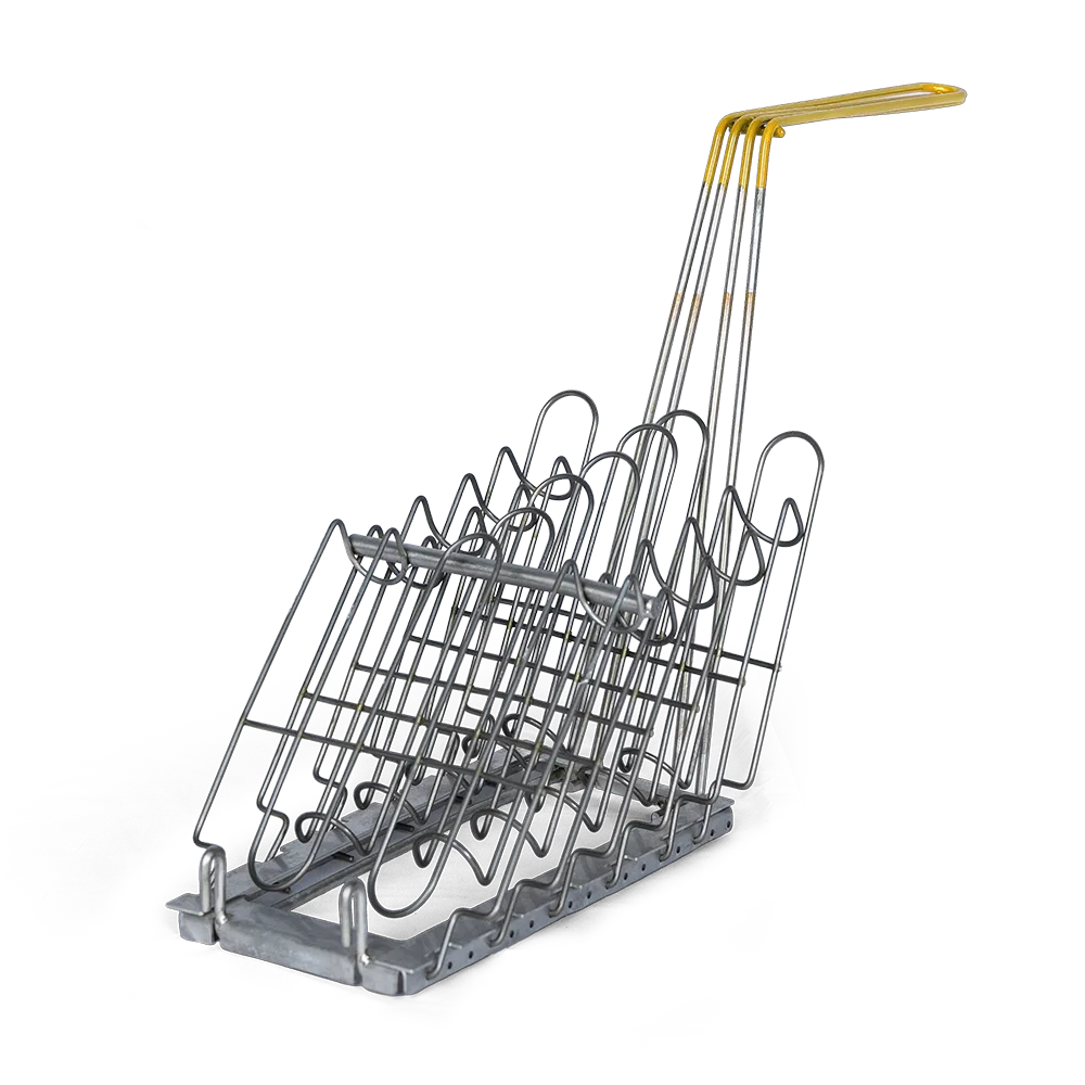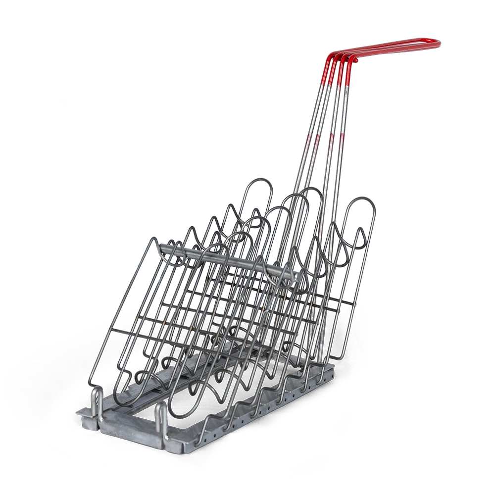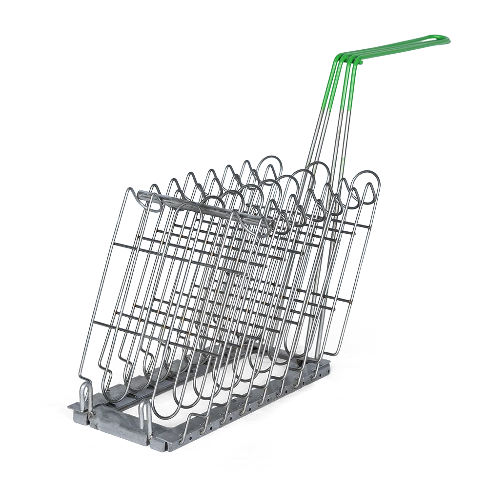 Durch die senkrechte bis schräge Anordnung der Auflagen kann das Volumen der Fritteuse optimal genutzt werden. Das bedeutet: bis zu drei Mal höhere Kapazität bei gleichem Platzbedarf. Gleichzeitig bleiben die Produkte voneinander getrennt, sodass kein Verkleben entsteht und die Nacharbeit entfällt.